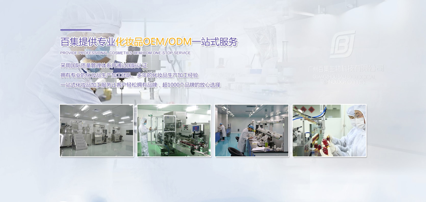 廣州市百集生物科技有限公司成立于2012年,坐落在亞洲化妝品硅谷的廣州市白云區(qū),是一家具有現(xiàn)代化管理、專(zhuān)業(yè)化水準(zhǔn)的化妝品研發(fā)及制造基地,為客戶(hù)提供專(zhuān)業(yè)的OEM/ODM一站式服務(wù),涵蓋產(chǎn)品規(guī)劃、配方開(kāi)發(fā)、包裝設(shè)計(jì)、功效測(cè)試、乳化、灌裝、包裝、倉(cāng)儲(chǔ)物流等全方位服務(wù)。產(chǎn)品涵蓋各類(lèi)化妝品水、乳、霜、膏、面膜、精華、BB霜、CC霜、素顏霜、精油及粉類(lèi)等成品及半成品,涵蓋日化線(xiàn)及專(zhuān)業(yè)線(xiàn)配方。公司秉承“創(chuàng)新、共贏(yíng)”的核心價(jià)值觀(guān)......